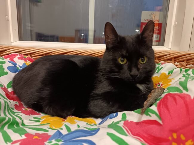 Kulta-Marie on noi 2-4-vuotias steriloitu, rokotettu ja sirutettu emokissa. Sen pennuista toinen tuli löytöeläintalolle ensin yksin ja kohta sitten toinen emonsa kanssa. Pennut ovat jo uusissa kodeissa. Kulta-Marie oli tullessaan erittäin arka, mutta pikkuhiljaa on alkanut hyväksyä ihmisenkin. Mutta kissakaverit ovat sille hyvin tärkeitä. On kiva vakoilla huoneeseen asennetun kameran kautta kuinka niin hillittynä pitämämme…