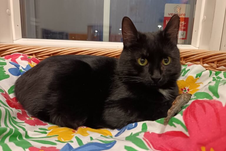 Kulta-Marie on noi 2-4-vuotias steriloitu, rokotettu ja sirutettu emokissa. Sen pennuista toinen tuli löytöeläintalolle ensin yksin ja kohta sitten toinen emonsa kanssa. Pennut ovat jo uusissa kodeissa. Kulta-Marie oli tullessaan erittäin arka, mutta pikkuhiljaa on alkanut hyväksyä ihmisenkin. Mutta kissakaverit ovat sille hyvin tärkeitä. On kiva vakoilla huoneeseen asennetun kameran kautta kuinka niin hillittynä pitämämme…